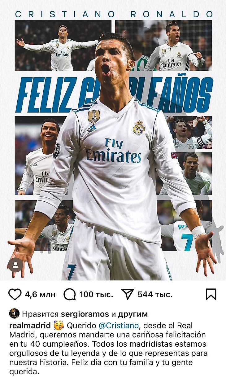 «Дорогой Криштиану, от лица мадридского «Реала» мы хотим поздравить тебя с твоим 40-летием. Каждый мадридиста горд тем, какой легендой ты являешься и то, как ты олицетворяешь нашу историю. Хорошего дня в кругу семьи и любимых».