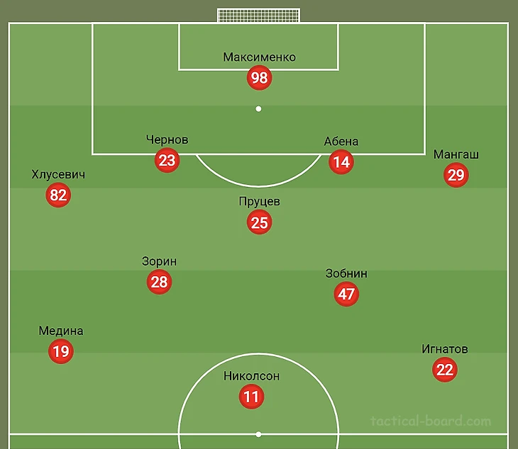 Пара нападающих была намного эффективнее: Мусаев выиграл почти всю борьбу на втором этаже и был главным в продвижении через лонгболлы, провёл образцовый тайм. Завершение в голевом эпизоде – блеск. Вторым нападающим стал Глебов и тоже удивил. Постоянно давал забегания за спину, хорошо взаимодействовал с партнёрами в быстрых отрывах. Видно, что Николич нашёл подходящую роль для Кирилла.
