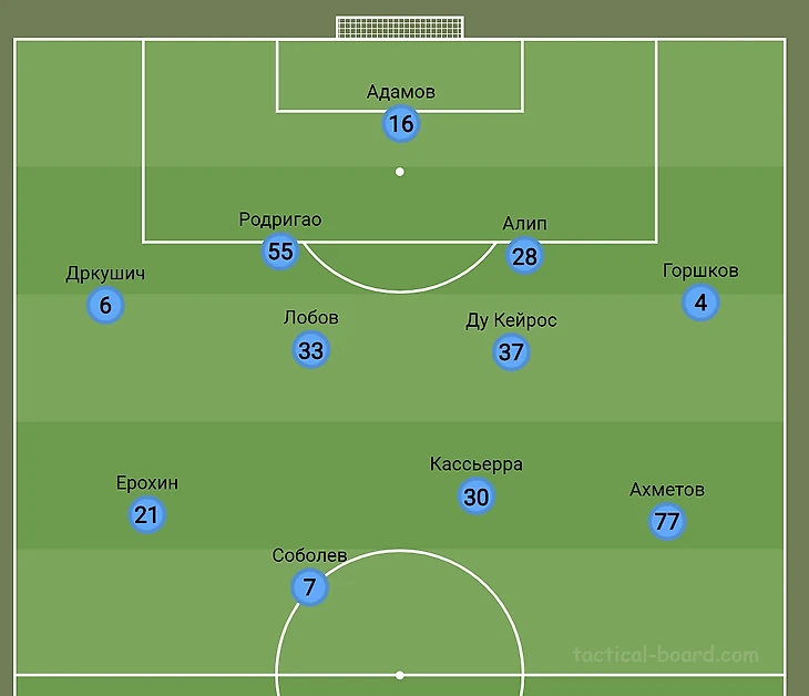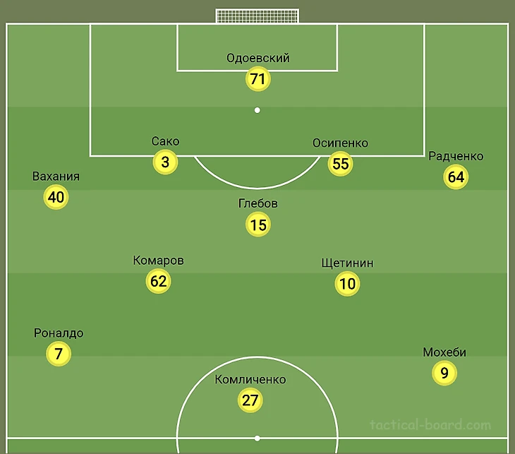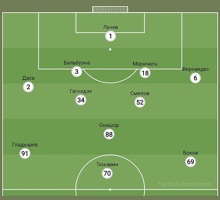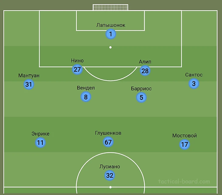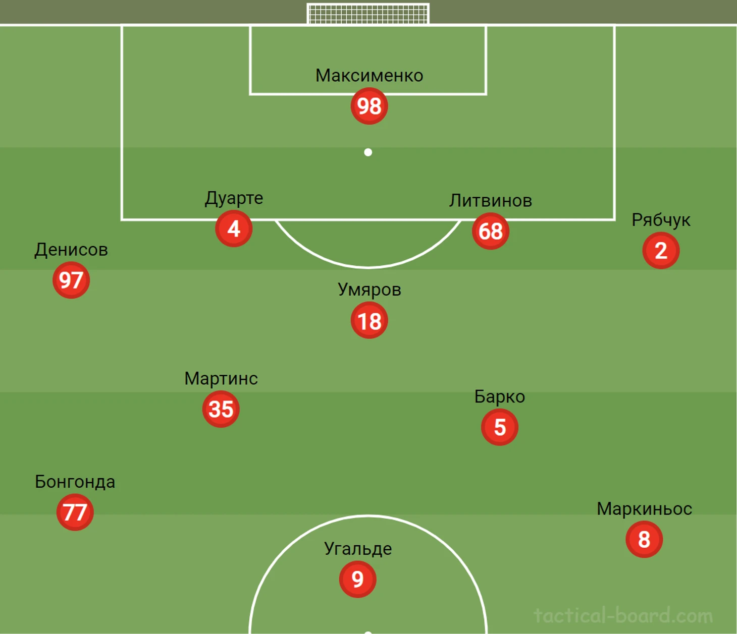 В стартовом составе тоже минимум изменений. Защитники хорошо двигали мяч с фланга на фланг, Денисов и Рябчук активно сдваивали края и постоянно бежали за спину, Барко активно продвигал мяч на дриблинге, а Угальде цеплялся за все мячи и прессинговал защитников.