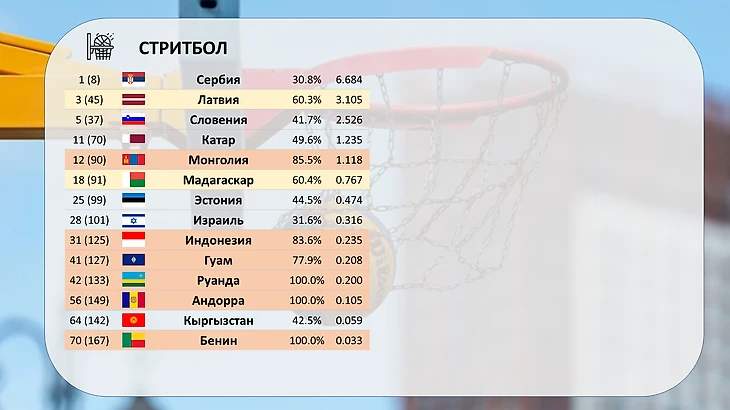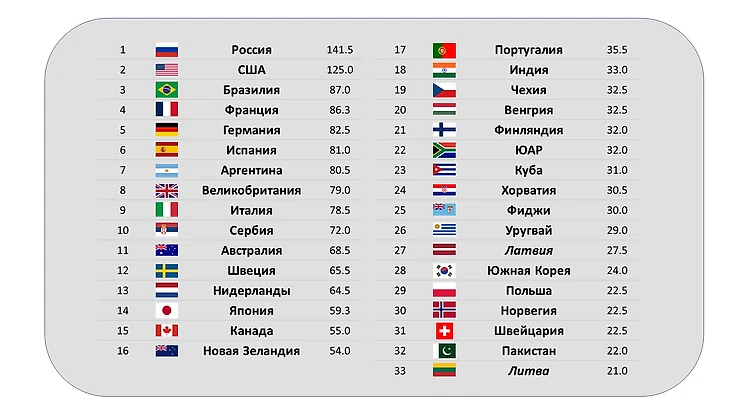 В результате топ изменился не сильно. Ушли Египет и Казахстан и добавились Латвия и Литва.