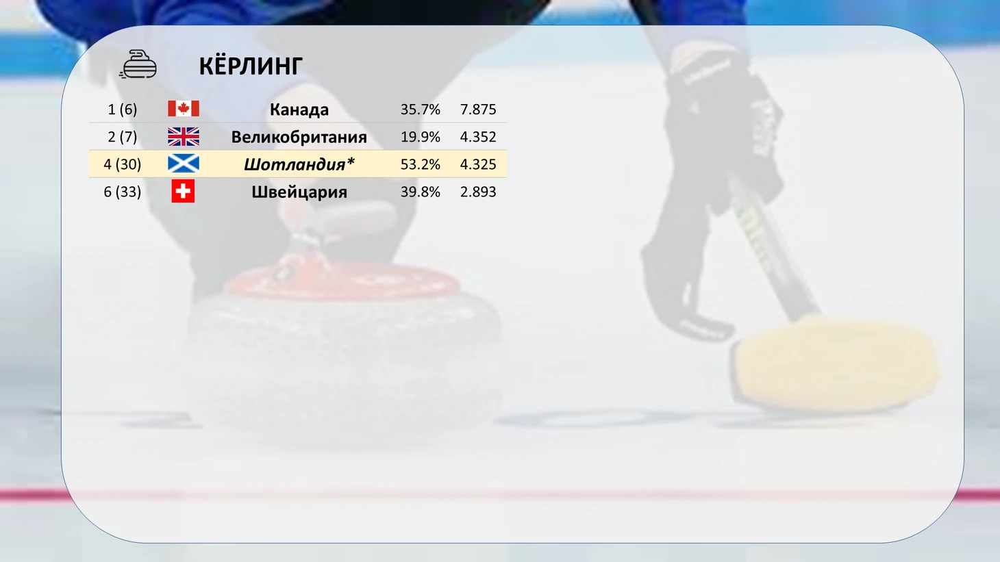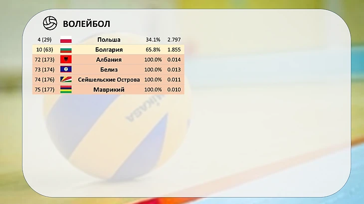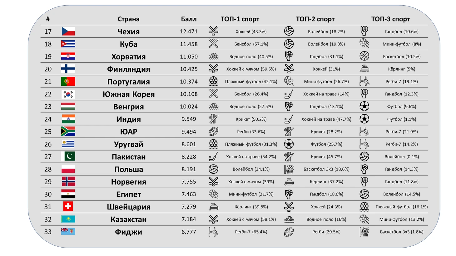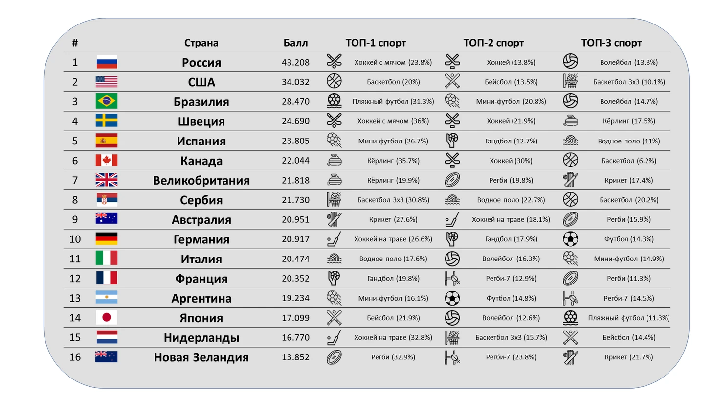 Итак, сам общий рейтинг ниже. Для топовых сборных (отобразил топ-33) я указал топ-3 вида спорта, в которых страна набрала наибольшее количество баллов. В скобах указана доля вида спорта от общей суммы по стране.