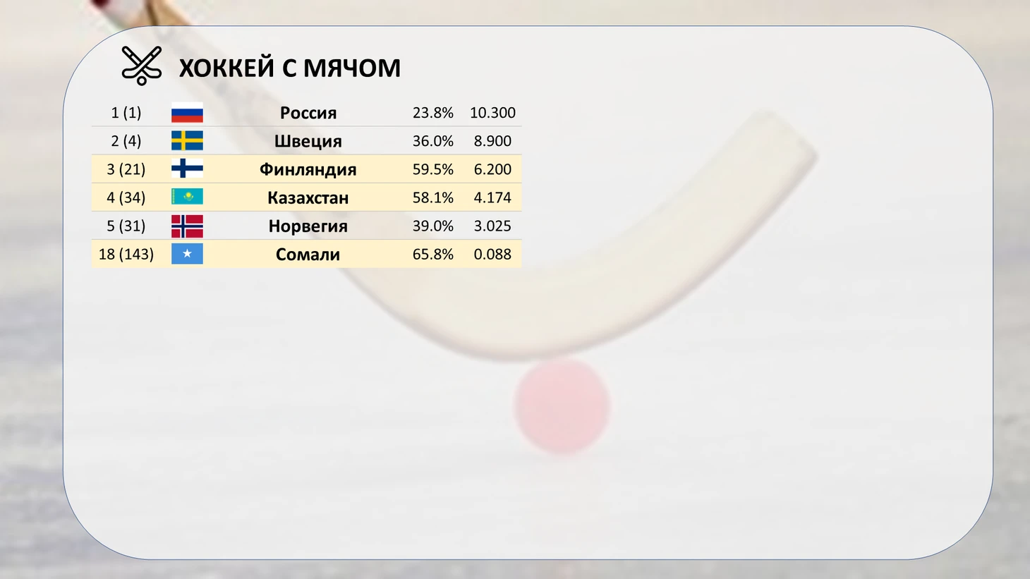 Если смотреть на Россию с 1991 года, то самые значимыми видами спорта являются бенди (28.1%), хоккей с шайбой (13.6%) и мини-футбол (11.8%).