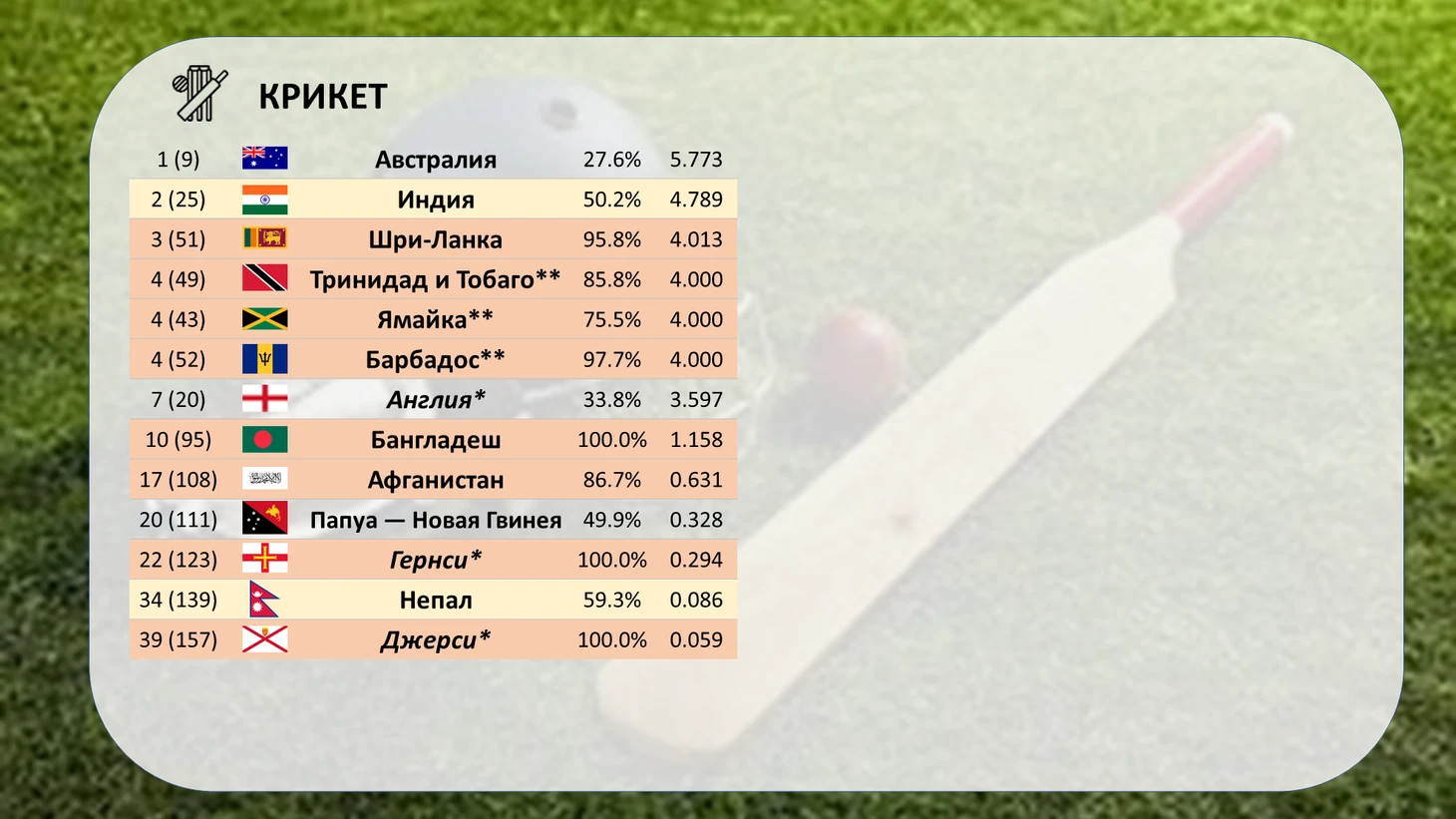 - Результаты Вест-Индии по крикету засчитываются Тринидаду и Тобаго, Багамам и Барбадосу.