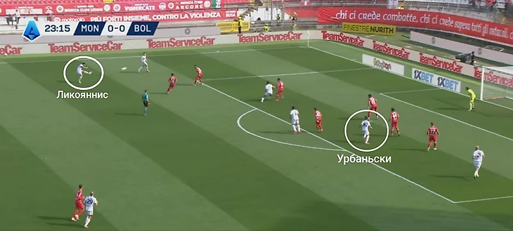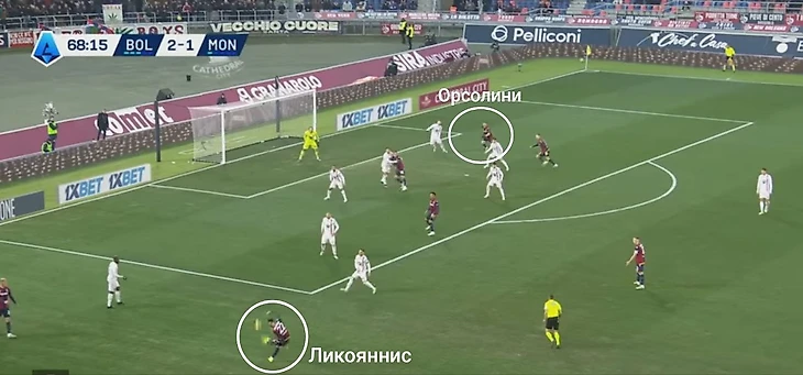 Ликояннис перебрасывает всех защитников «Монцы». Мяч оказываетсяпод левой у Орсолини – в таких случаях это почти всегда гол. Так получилось и здесь.