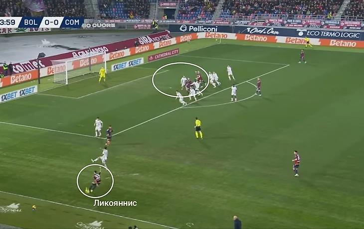 Ликояннис разыграл штрафной с Моро и получил обратную передачу от экс-игрока московского «Динамо». Подача – вновь высший класс, поскольку она пришлась ровно туда, гдеу БФК было численное преимущество. 1-0, гол забьет другой крайний защитник, Де Сильвестри.