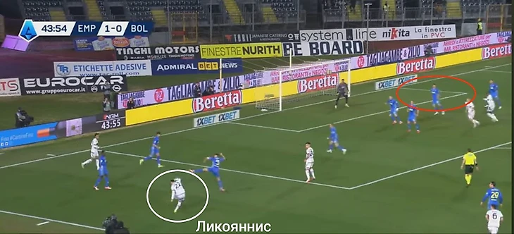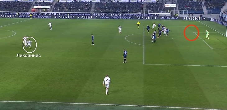 Игра с «Эмполи». Ликояннис подает крученый мяч на дальнюю – туда вбежит оставшийся за кадром Домингес. 1-1.
