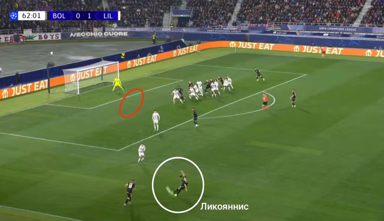 Матч ЛЧ с «Лиллем». Ликояннис подает на ближнюю штангу. Расчет сработал – Лукуми правильно открылся и забил первый гол БФК в турнире.