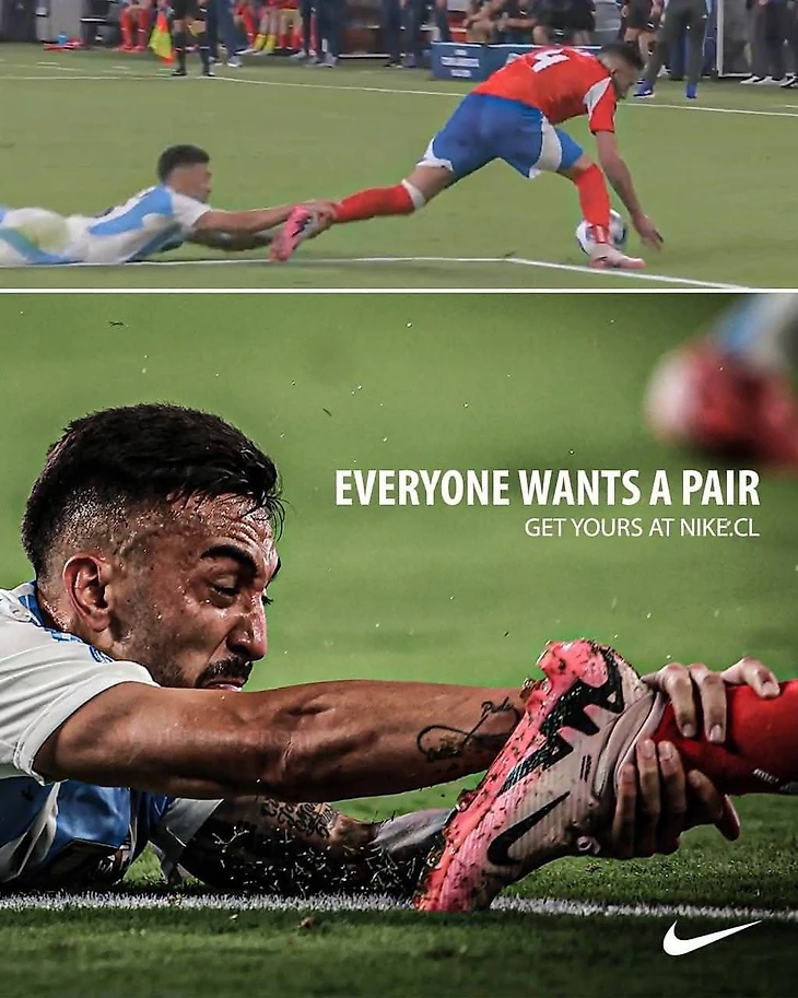 Компания Nike взяла известное изображение из игры Аргентина-Чили на Кубке Америки 2024 года и превратила его во впечатляющую рекламу.