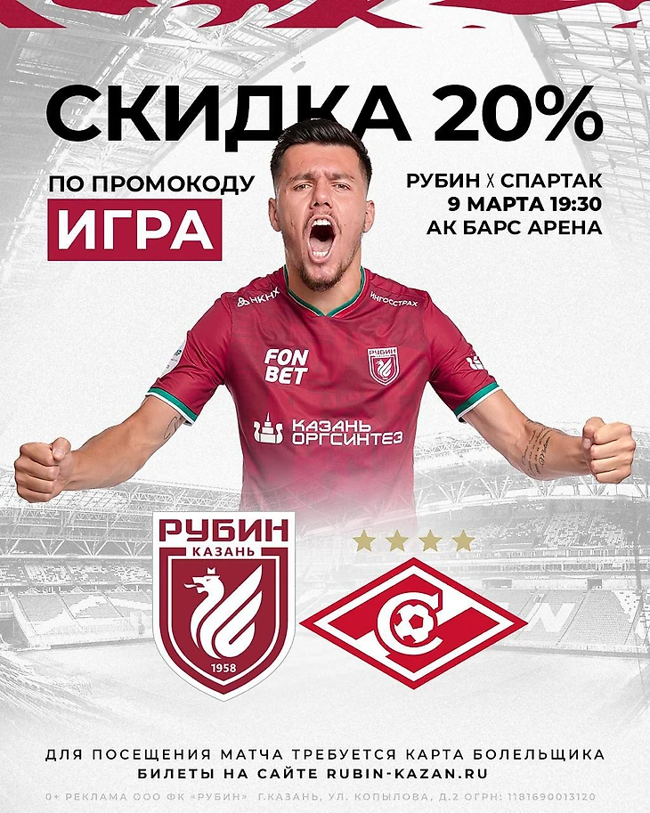 Успей купить билеты на топовый футбольный матч РУБИН - СПАРТАК со скидкой 20% по промокоду "ИГРА"