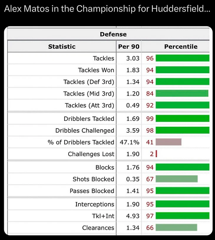 Открываем теперь защитную статистику Матоса в «Хаддерсфилде» и там видим его прям настоящим ястребом своей команды. Своему партнеру по центру поля Дэвиду Касуму он ощутимо уступил только в том компоненте, что гораздо чаще становился жертвой обводок.