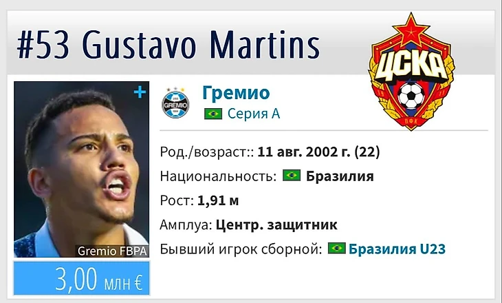 Московские «Спартак» и ЦСКА, а также казанский «Рубин» проявляют интерес к 22-летнему центральному защитнику «Гремио» Густаво Мартинсу.