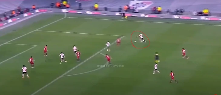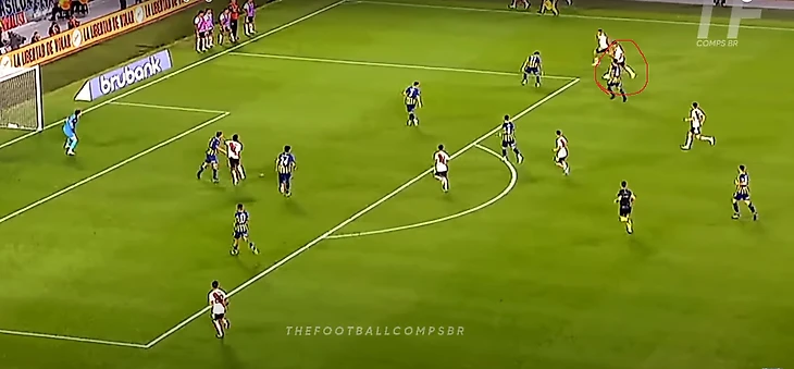 Солари с мячом на углу штрафной, справа открывается партнёр и отдать ему в лицевую – самое очевидное и простое решение. Можно начать обыгрывать, улучшая позицию, можно отдать во второй темп другому открытому партнёру чуть позади. Можно и навесить, но Пабло выбирает изумительный вариант продолжения атаки, который даже со стоп-кадра телекартинки разглядеть непросто: