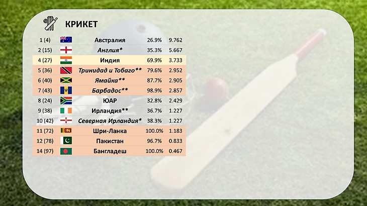 Результаты Вест-Индии по крикету засчитываются Тринидаду и Тобаго, Багамам и Барбадосу.