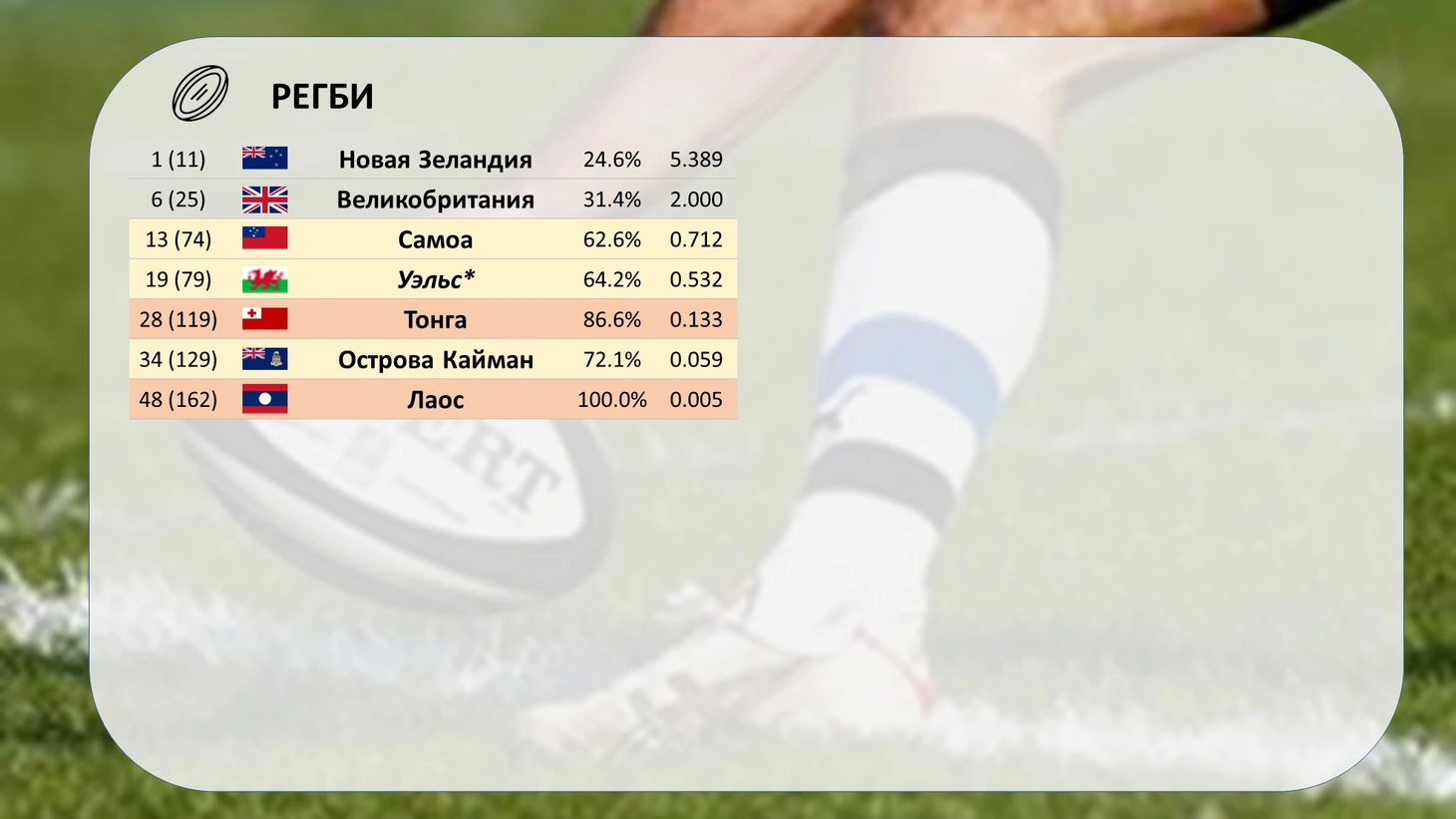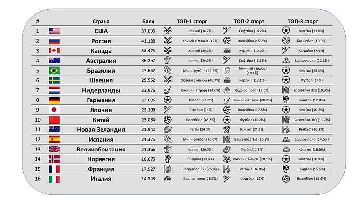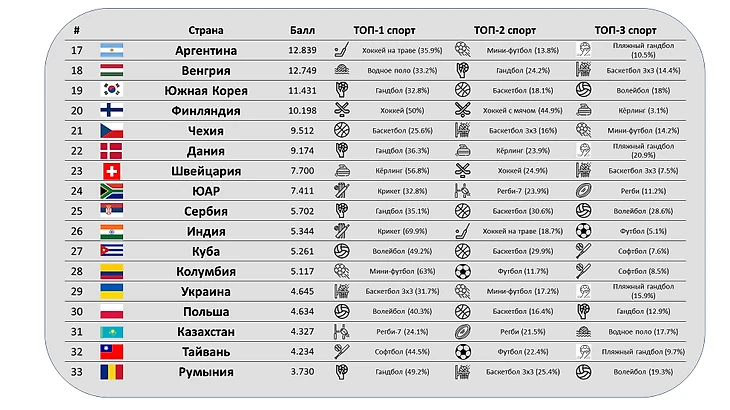 Для топовых сборных я указал топ-3 вида спорта, в которых страна набрала наибольшее количество баллов. В скобах указана доля вида спорта от общей суммы по стране.