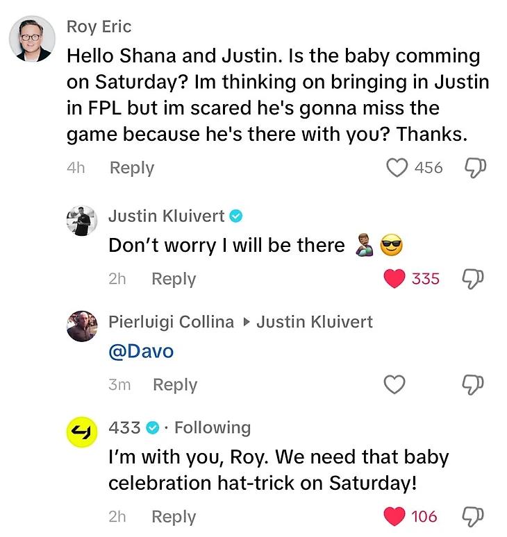 «Привет, Шана и Джастин! Скажите, родится ли ребенок в субботу? Я думаю взять Джастина в FPL [фэнтези-турнире АПЛ], но переживаю, что он пропустит игру, потому что в это время будет рядом с тобой [в роддоме]. Спасибо», – интересуется фанат.