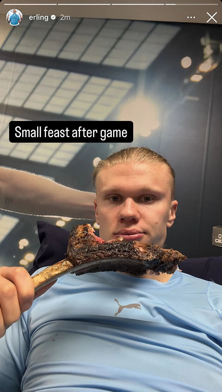 После уверенной победы «Манчестер Сити» над «Ньюкаслом» (4:0) норвежец поделился фотографией своего ужина. На снимке — наполовину съеденная баранина, которую сам Холанд назвал «скромным пиршеством».