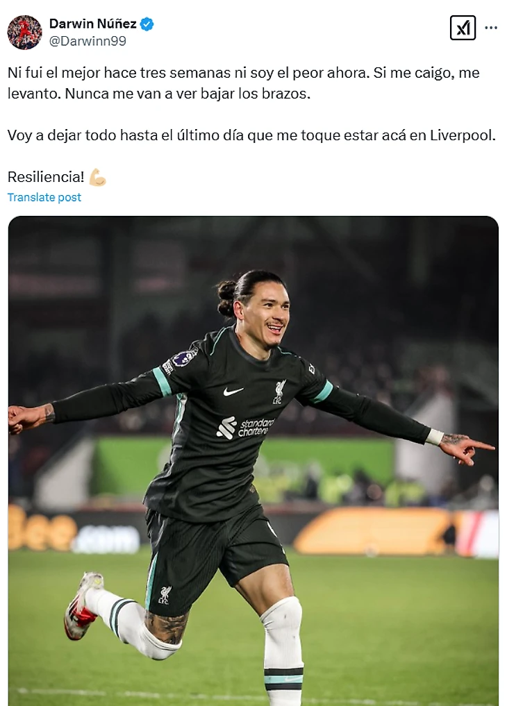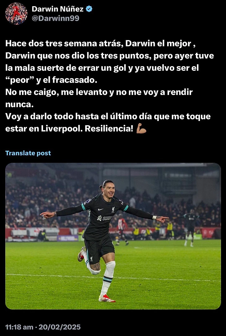 «Две-три недели назад Дарвин был лучшим, Дарвин принес нам три очка, но вчера мне не повезло, я упустил возможность, и я снова «худший» и неудачник. Я не падаю, я встаю, никогда не собираюсь сдаваться. Я собираюсь выкладываться до последнего дня, пока я здесь, в «Ливерпуле». Стойкость!»