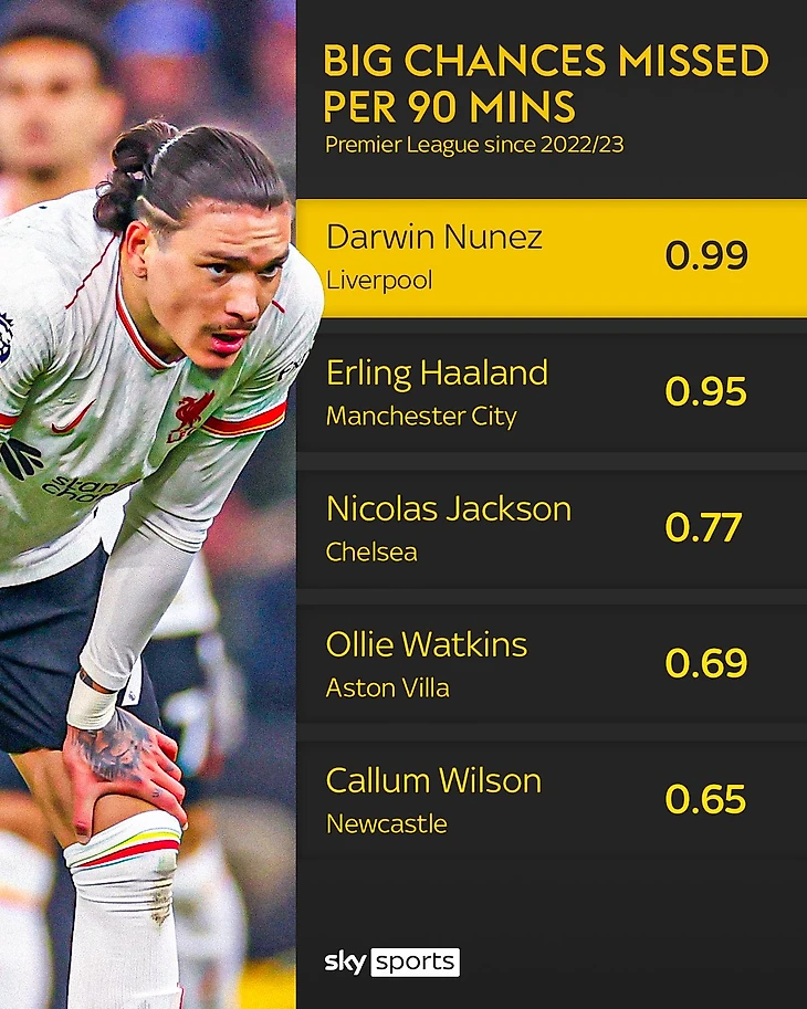 Sky Sports подсчитал, что с сезона-2022/23 Нуньес упускает почти по одному крупному шансу в каждом матче АПЛ – это худший показатель лиги.