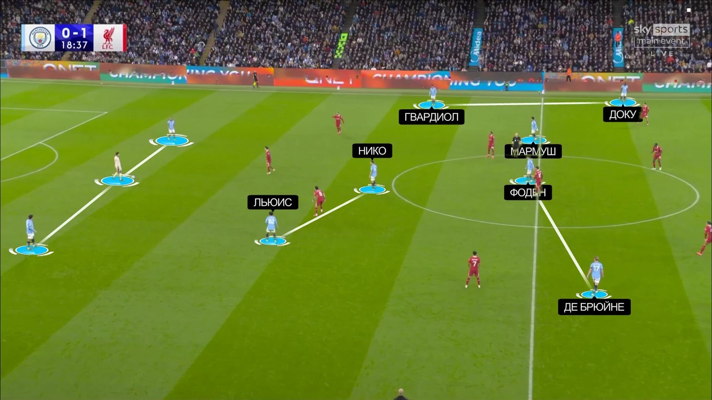 Необычным образом заполняли края. Правый фланг – только Савио, а слева двойную ширину давали Йошко Гвардиол и Доку. Никто из них не сваливался в центр в первой стадии. Это нетипично для систем Пепа. Рико Льюис и Нико Гонсалес отвечали за центр поля. Около чужой опорной открывались Де Брюйне, Фоден и Мармуш.