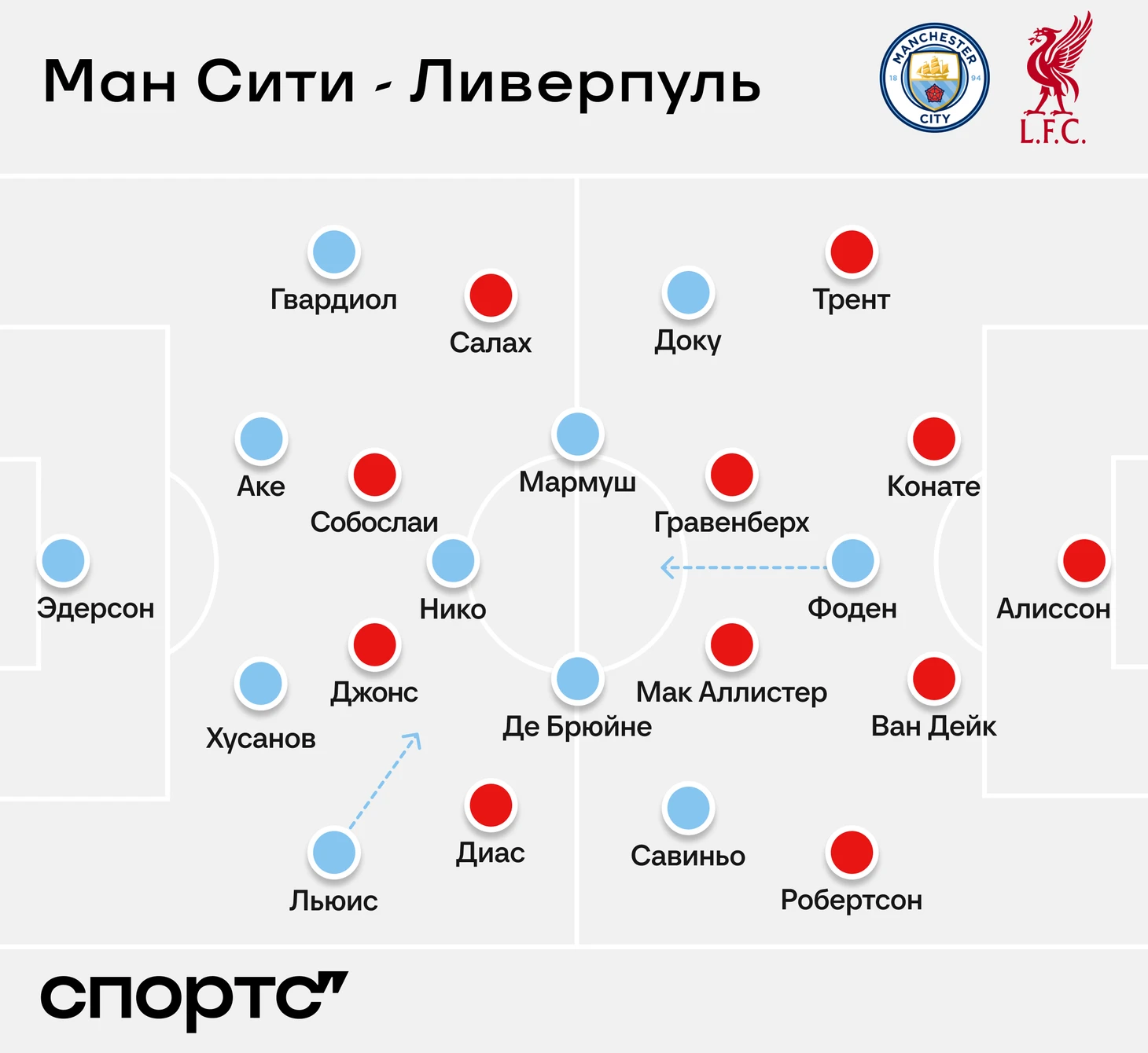 Пеп Гвардиола ждал, что Эрлинг Холанд поправится, но его даже не включили в заявку. В этот раз подменять его вышел Фил Фоден в роли ложной девятки. За ним расположилось очень атакующее сочетание из пары дриблеров Савиньо – Жереми Доку, плеймейкера Кевина де Брюйне и скрытого форварда Омара Мармуша. Пеп не скрывал перед матчем, что главное требование к такому составу – забить как можно больше.