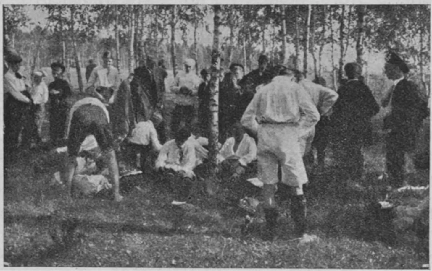 Здѣсь есть и свои футбольные „герои», по которымъ вздыхають дачныя барышни. Интересно посмотрѣть на футболистовъ, когда они возвращаются по домамъ «съ поля битвы». Важные, какь-будто только что свершившіе великій подвигъ. Въ коротенькихъ штанишкахъ, обнажающихъ загорѣлыя, сильныя ноги. Почти каждаго футболиста провожаетъ съ поля „обожательница» — дачная барышня. Ноги у футболистовъ покрыты синяками и ссадинами. Бываетъ, что футболистъ дня три прихрамываетъ и не выходить «на работу»...