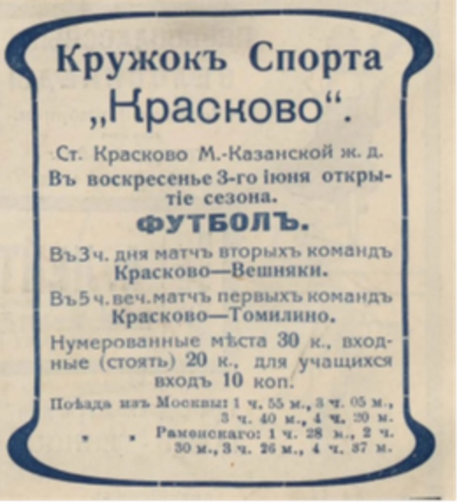 Процесс становления дачного футбола продолжился в мае. В Краскове состоялось собрание представителей спортивных организаций Московско-Казанской железной дороги. Основной целью было объединение этих обществ в единую лигу. От «Чухлинка-Шереметевского кружка спорта» - Г.Ф. Энгелке, от «Вешняковского спортивного кружка» - А. К. Кельберер, от Томилинского спортивного общества – А.И. Филиппов, от кружка спорта «Красково» - Н.А. Гюбиев, А.О. Ерофеев, Е.И. Кузнецов, А.Р. Менделевич, И.Р. Менделевич, А. А. Орлов и звезда велоспорта Николай Похильский, от кружка спорта «Малаховка» - М. Ф. Бауэр, И.Р. Бек и И.А. Засорин, от Раменского – П.Н. Иванов.