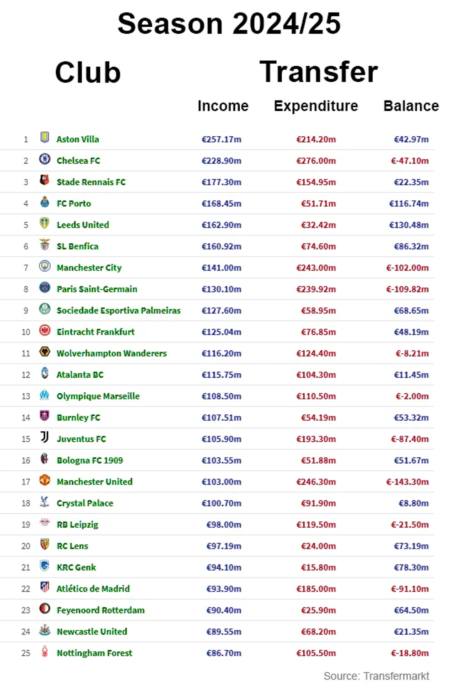 Топ-25 клубов по доходам от трансферов в сезоне-2024/25 по версии Transfermarkt. В тройке две неожиданные команды