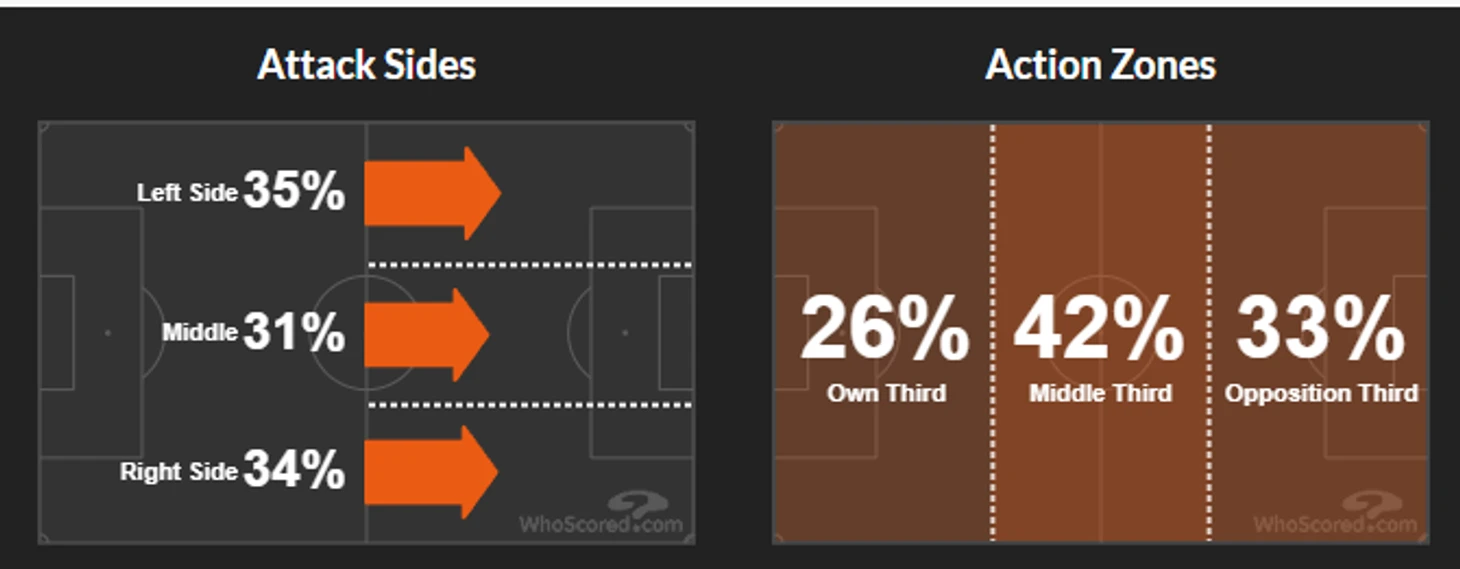 Чаще всего атакуют через короткий пас, достаточно редко прибегая к длинным передачам. Используют фланги и центр почти в равной мере.