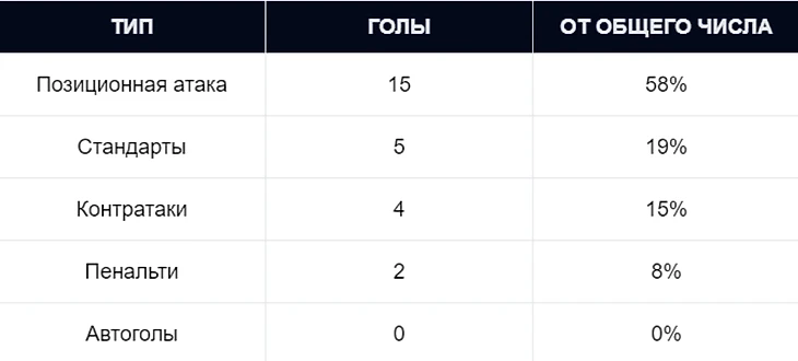 Но большую часть голов “Локомотив” забил в позиционных атаках, 48% от общего числа. По этому показателю “Локо” занимает 8 место в лиге