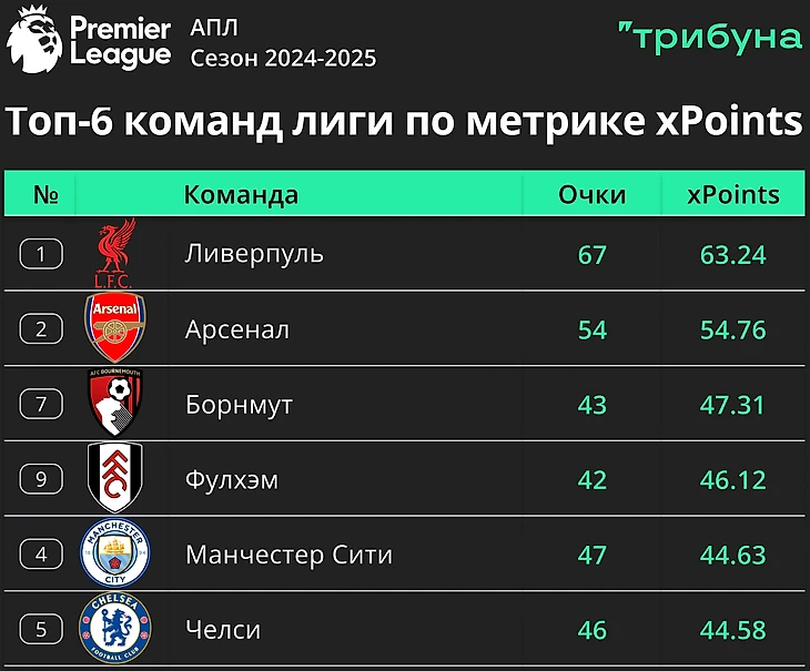 Даже если не учитывать лишние матчи в запасе у всех команд из списка, кроме «Ливерпуля» (сыграли 28 матчей против 27 у остальных) – все равно преимущество в 10 очков над вторым местом выглядит очень внушительным. «Арсенал» прочно удерживает вторую строчку в таблице, для борьбы с «Ливерпулем» не хватает стабильности и более качественной игры в нападении. За третье место будет настоящая борьба: помимо четырех команд из списка на топ-3 чемпионата претендует так же «Ноттингем Форест», который набрал на 9 очков больше, чем должен был по xPoints, а также «Ньюкасл Юнайтед», «Брайтон» и «Астон Вилла». Невероятно серьезная борьба за попадание в зону ЛЧ нас ждет в концовке чемпионата!
