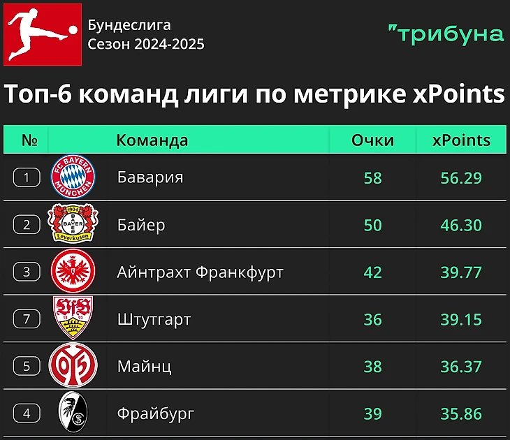 1) фактически занявших первые 5 мест в своем чемпионате с командами, занявшими топ-5 по показателю xPoints. Необязательно первой по xPoints команде занимать 1-ое место в чемпионате. Достаточно войти в топ-5.