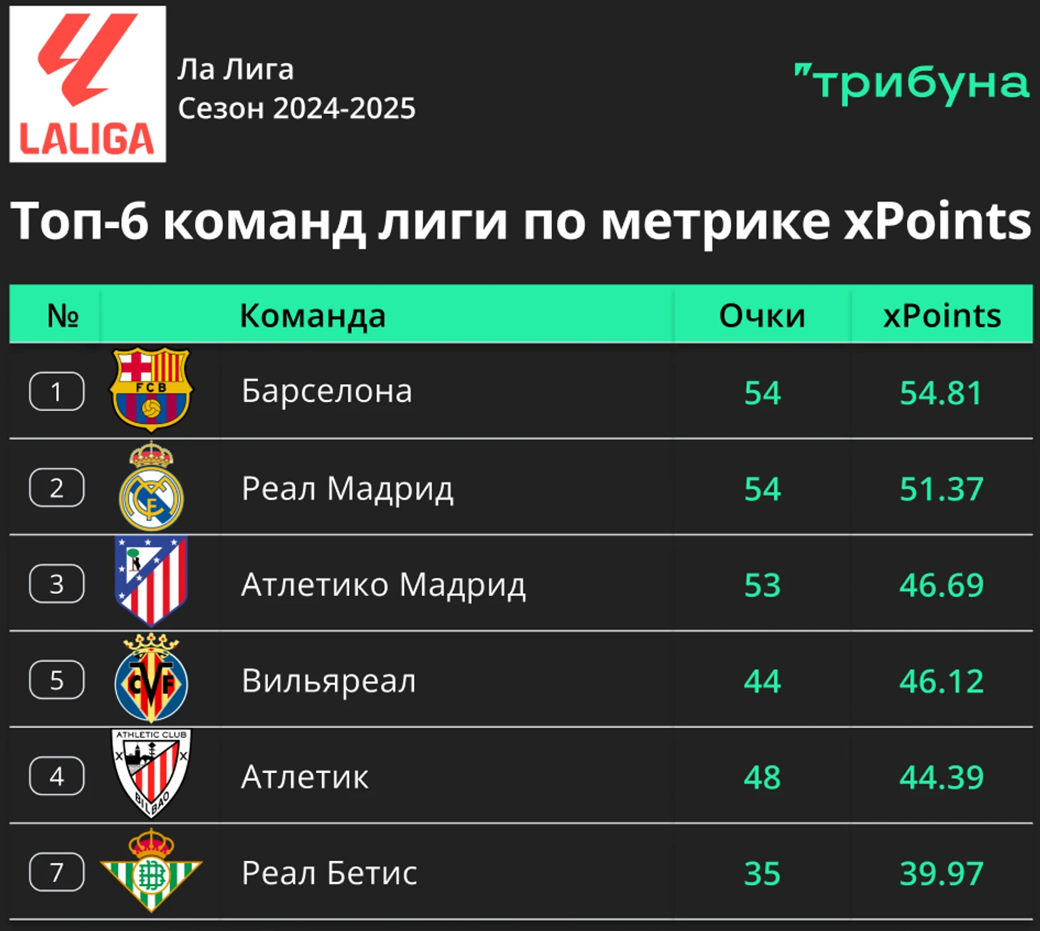 Но учитывая, что если бы не нестабильный отрезок «Барселоны» в ноябре-декабре 2024 года и проблемы с поиском игры и адаптацией у «Реал Мадрида» в начале сезона, то навряд ли «Атлетико» был так близок, это просто третья по качеству команда Испании, которая воспользовалась осечками конкурентов и подобралась вплотную к ним. В тем более еще и повезло им в некоторых матчах, судя по разнице фактически набранных очков с xPoints.