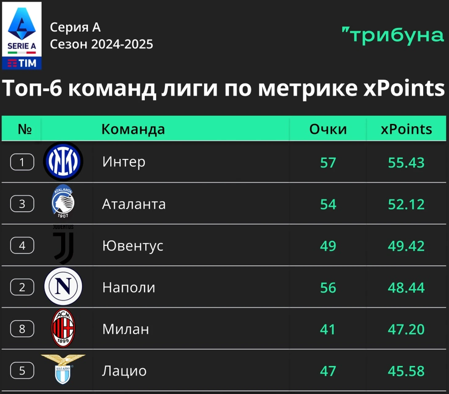 В Серии А борьба за чемпионство в самом разгаре. «Наполи» – самый везучий клуб из претендующих на победу в чемпионате, судя по xPoints. «Интер» и «Аталанта» же являются самыми «справедливыми» соперниками за звание лучшего. «Ювентус» тоже нельзя сбрасывать со счетов, несмотря на их невзрачную игру.