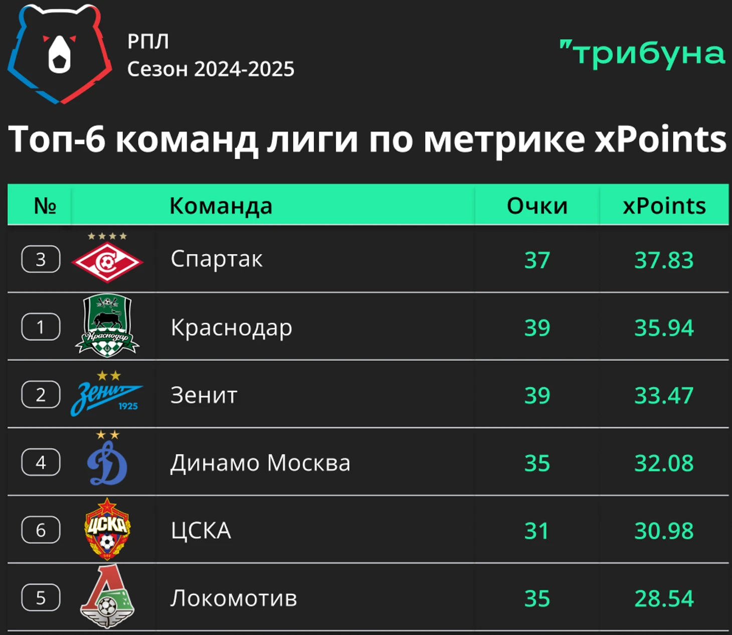 Действительно, считается, что xPoints если не самый, то, как минимум, один из самых точных показателей в футболе, благодаря которому можно в том числе прогнозировать будущих чемпионов, смотреть на тенденцию изменения мест команд в таблице по ходу чемпионата.