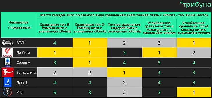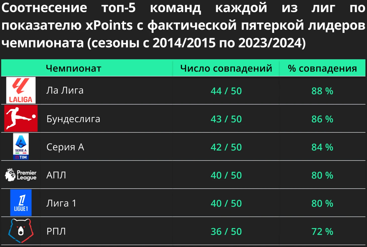 4) будет изучено точное и полное соответствие занятого места по xPoints c итоговым местом в таблице. То есть первая команда по xPoints должна занять только 1-е место в чемпионате, 2-я команда – только 2-е место и т.д., иначе результат не учитывается.