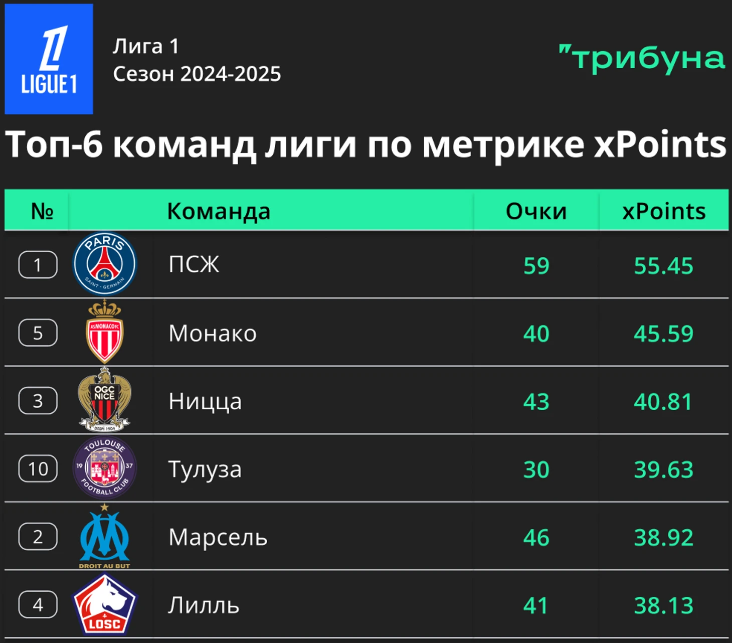 Что ж, с победителем лиги все уже решено, традиционно ПСЖ доминирует в чемпионате Франции, спокойно справляясь без ушедшего в «Реал Мадрид» Мбаппе. А вот за места со 2-го по 5-е будет очень плотная борьба. Судя по xPoints «Марселю» везет, а «Монако» наоборот не досчитался своих очков.