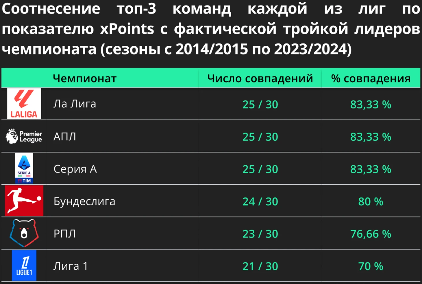 2) фактически занявших первые 3 места в своем чемпионате с командами, занявшими топ-3 по показателю xPoints. Необязательно первой по xPoints команде занимать 1-ое место в чемпионате. Достаточно войти в топ-3.