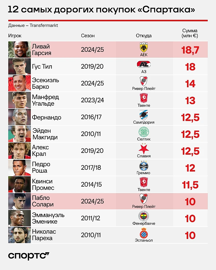 ● Четверть игроков из этого топа куплены с начала 2024-го, причем трое из них – Ливай Гарсия, Эсекиэль Барко и Манфред Угальде – вошли в четверку самых дорогих приобретений «Спартака».