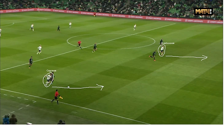 На 41-й минуте гости реализовали свой момент. После идеальной передачи Сергеева, Олейников забивает гол и открывает счёт в матче. Тут конечно же вопросы к Кайо, который не создал искусственный офсайд. В целом по первому тайму есть вопросы к опорной зоне. Ленини просто не смог один прерывать все контратаки самарцев. Поэтому выход Кривцова в старте сломал структуру игры хозяев.