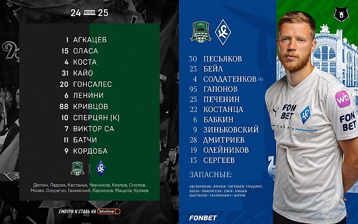 Стартовый состав Краснодара вызвало у меня небольшое удивление. Я лично ожидал, что выйдет Касатньо в опорной зоне, а вместо Гонсалеса выйдет Петров. Но как выяснилось Сергей приболел, а из-за лимита Кастаньо не смог появиться в старте. Вышел Кривцов, который по ощущениям дизбалансировал игру хозяев. У Крыльев остался в запасе Евгеньев и Гальдамес, что у меня тоже вызвало небольшое удивление.