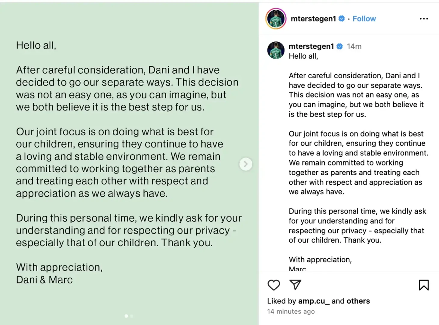 Тер Стеген объявил о расставании со своей женой Даниэлой на восьмом году брака. В эмоциональном посте в соцсетях он признался, что это было непростое решение, но они решили двигаться дальше отдельно.