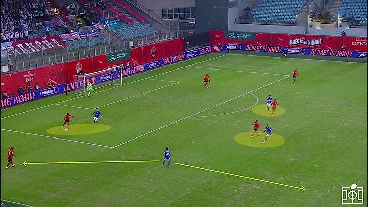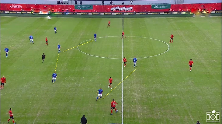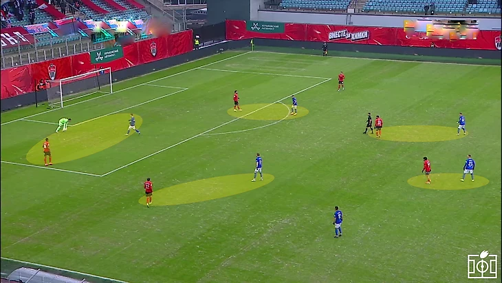 Акцент на атаки левым флангом обеспечил пространство для подключений Антона Ковалева в зоне правого фланга, в ходе которых Ломовицкий смещался в центральную зону, по сути составляя Владимиру Ильину пару на позиции форварда.