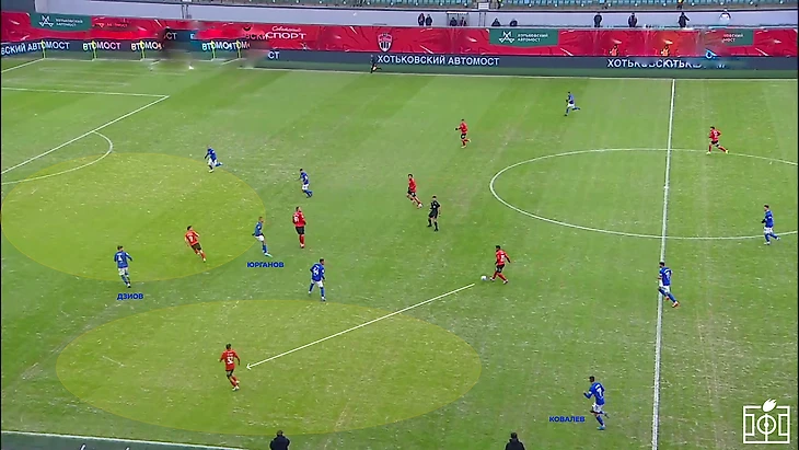 Причиной пропущенного гола стали несогласованные действия в обороне. На скриншоте видно, что в момент скидки Заболотного Юрганов не держит ни одного игрока, из-за чего Божину приходится опекать Александра Филина, а Альшину — справляться с высокорослым Фаринья.