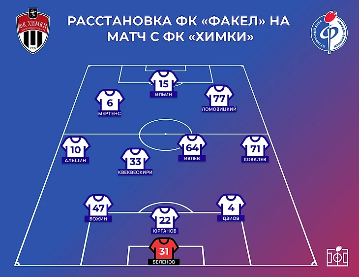 На матч с командой «Химки» «Факел» вышел в схеме 3-4-3, переходя в 5-4-1 при обороне. Владимир Ильин занял позицию центрального форварда, а Дилан Мертенс и Александр Ломовицкий расположились на позициях левого и правого инсайдов соответственно.