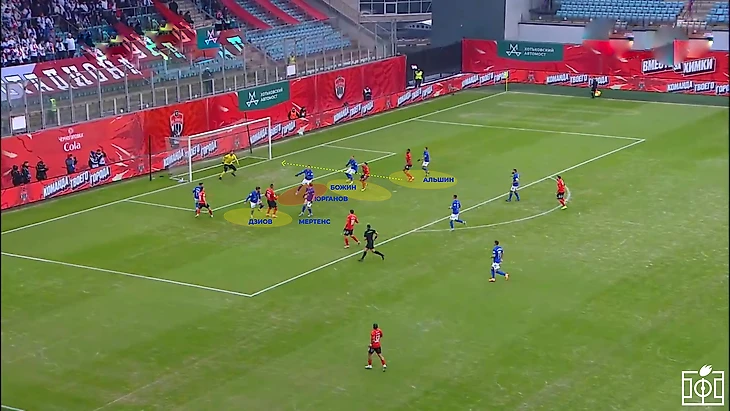 В первом тайме игроки «Факела» активно перегружали левый фланг, где ключевую роль играл Дилан Мертенс. Он был главным адресатом как для длинных диагональных передач, так и для розыгрышей через третьего игрока.