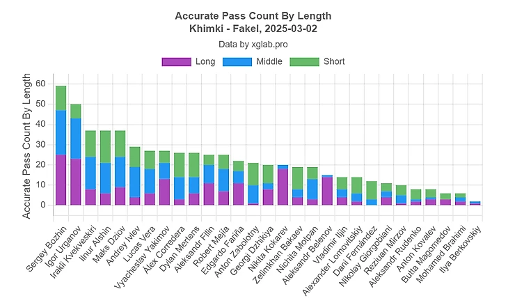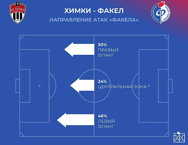 Однако главным оружием «Факела» в матче с «Химками» стали длинные диагональные передачи Сергея Божина в зону левого фланга. По итогам встречи на его счету 70 точных передач, из которых 20 были прогрессивными, а 3 — ключевыми, что стало лучшим показателем среди игроков команды.