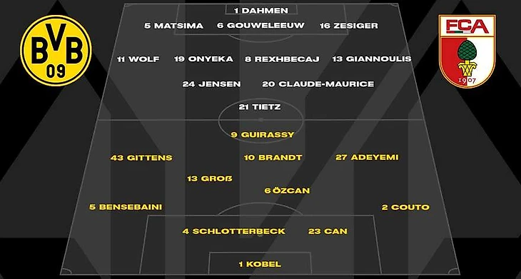 Главный тренер хозяев Нико Ковач, по сравнению с последней игрой Лиги Чемпионов против «Лилля», в стартовом составе сделал 3 замены: Грегор Кобель, Рами Бенсебаини (вместо Свенссона), Нико Шлоттербек, Эмре Джан, Иан Коуто (вместо Рюэрсона), Паскаль Гросс, Салих Озджан (вместо Забитцера), Джейми Гиттенс, Юлиан Брандт, Карим Адейеми и Серу Гирасси. Но тактика осталась такой же: при собственном владении мячом расстановка 4-2-3-1 менялась на 3-2-4-1, когда Бенсебаини смещался в опорную зону к Озджану, а Гросс на пару с Брандтом формировал сдвоенную «десятку».