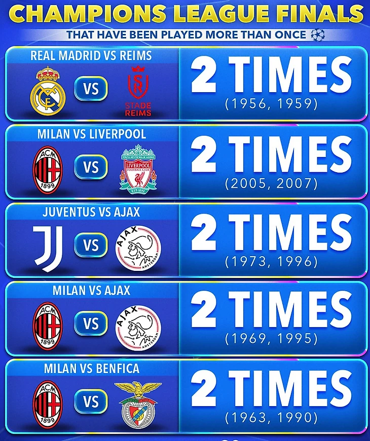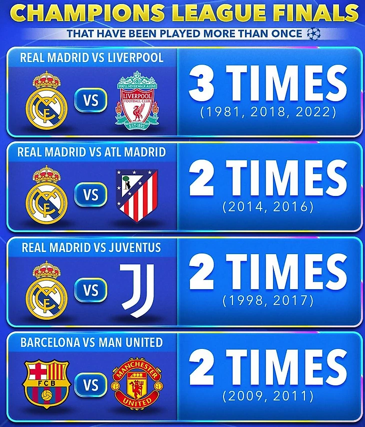 Финалы Лиги чемпионов, которые повторялись. Только одна пара встречалась трижды – есть шанс и в этом году