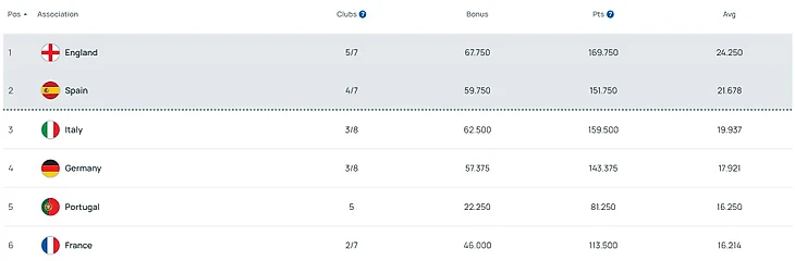 В текущем сезоне все стало на свои места, и Англия лидирует с огромным отрывом: после вчерашнего дня у нее, согласно официальному сайту УЕФА, 24.2 очка (напомню, что общие баллы, набранные ассоциацией, делятся на количество команд, начавших евросезон), а у идущей третьей Италии 19.9.