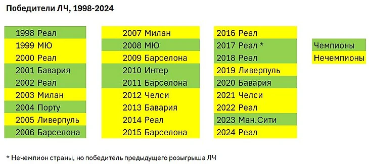 В следующем розыгрыше добавились команды, занявшие вторые места в чемпионатах, и еще через год ЛЧ выиграл «МЮ» (тот самый знаменитый требл), закончивший предыдущий сезон в Англии вторым. В «нечемпионском» формате на сегодняшний день прошло уже 27 розыгрышей, и лишь в 12 из них (44%) победил действующий чемпион (свой страны или самой ЛЧ) – такие случае в таблице ниже выделены зеленым. Чаще всего (пять раз) этот трюк удавался «Реалу» – хотя, наверное, это просто потому, что мадридцы в принципе выигрывают этот турнир чаще всех.